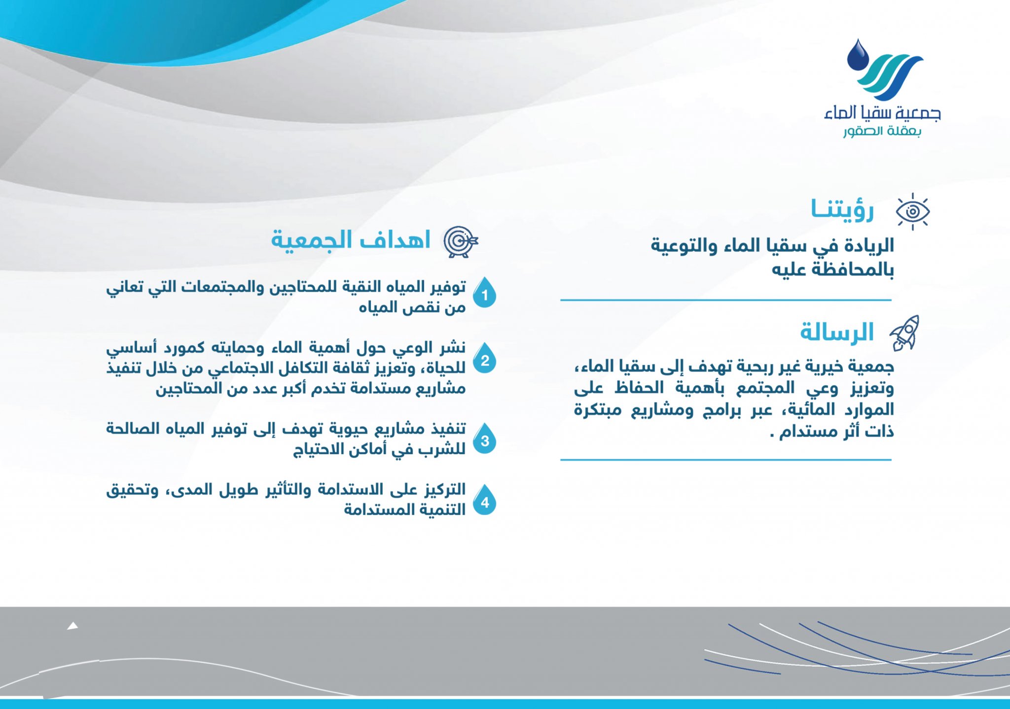 وتسعى الجمعية إلى تحقيق رسالتها عبر برامج نوعية تشمل سقيا الأسر المحتاجة، وسقيا المساجد، وسقيا السبيل، ودعم حلول توفير المياه، إلى جانب تعزيز الوعي المجتمعي بأهمية المحافظة على المياه وترشيد استهلاكها.